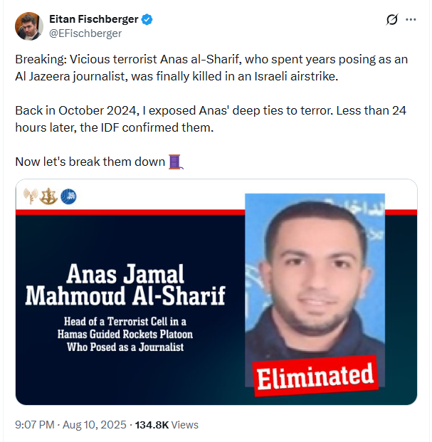 Incitement #58Breaking: Vicious terrorist Anas al-Sharif, who spent years posing as an Al Jazeera journalist, was finally killed in an Israeli airstrike. Back in October 2024, I exposed Anas' deep ties to terror. Less than 24 hours later, the IDF confirmed them. Now let's break them down 🧵