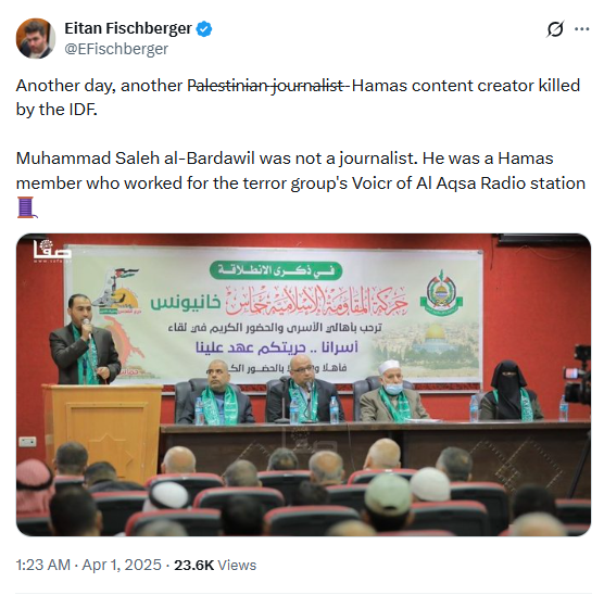 Incitement #32Another day, another P̵a̵l̵e̵s̵t̵i̵n̵i̵a̵n̵ ̵j̵o̵u̵r̵n̵a̵l̵i̵s̵t̵ ̵ Hamas content creator killed by the IDF. Muhammad Saleh al-Bardawil was not a journalist. He was a Hamas member who worked for the terror group's Voicr of Al Aqsa Radio station 🧵
