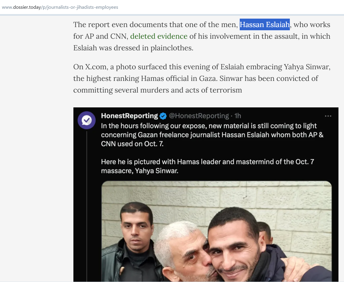 Incitement #16Journalists or Jihadists? Employees of American news agencies were embedded in plainclothes with Hamas during Oct 7 massacre "The report even documents that one of the men, Hassan Eslaiah, who works for AP and CNN, deleted evidence of his involvement in the assault, in which Eslaiah was dressed in plainclothes. On X.com, a photo surfaced this evening of Eslaiah embracing Yahya Sinwar, the highest ranking Hamas official in Gaza. Sinwar has been convicted of committing several murders and acts of terrorism"