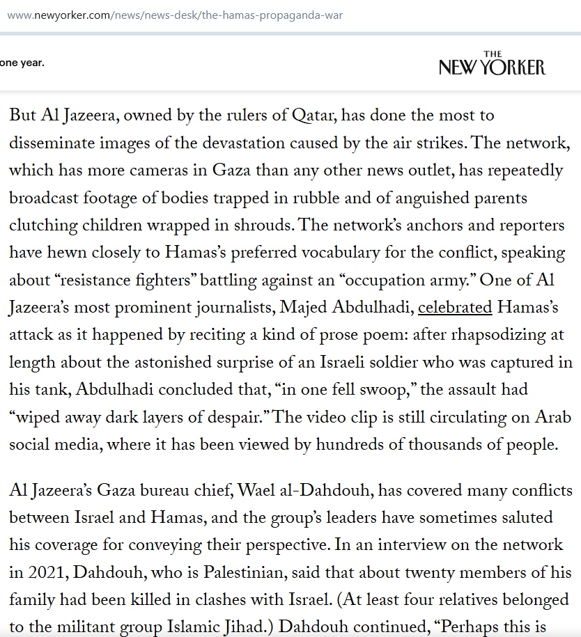 Incitement #54One of Al Jazeera’s most prominent journalists, Majed Abdulhadi, celebrated Hamas’s attack as it happened by reciting a kind of prose poem: after rhapsodizing at length about the astonished surprise of an Israeli soldier who was captured in his tank, Abdulhadi concluded that, “in one fell swoop,” the assault had “wiped away dark layers of despair.” The video clip is still circulating on Arab social media, where it has been viewed by hundreds of thousands of people. Al Jazeera’s Gaza bureau chief, Wael al-Dahdouh, has covered many conflicts between Israel and Hamas, and the group’s leaders have sometimes saluted his coverage for conveying their perspective. In an interview on the network in 2021, Dahdouh, who is Palestinian, said that about twenty members of his family had been killed in clashes with Israel. (At least four relatives belonged to the militant group Islamic Jihad.)