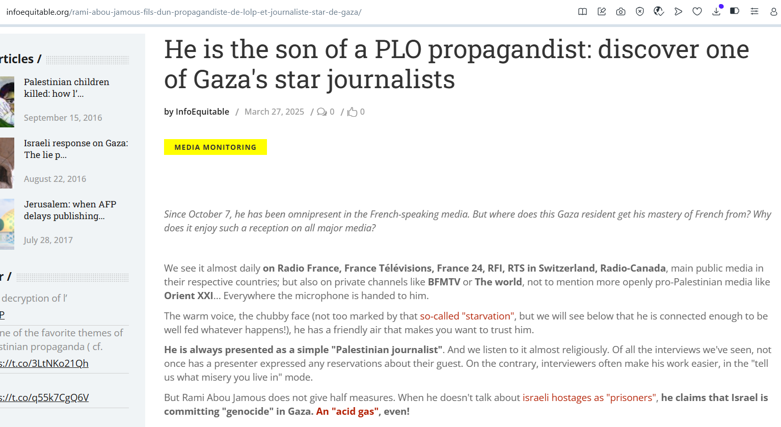 Incitement #82The warm voice, the chubby face (not too marked by that so-called "starvation", but we will see below that he is connected enough to be well fed whatever happens!), he has a friendly air that makes you want to trust him. He is always presented as a simple "Palestinian journalist". And we listen to it almost religiously. Of all the interviews we've seen, not once has a presenter expressed any reservations about their guest. On the contrary, interviewers often make his work easier, in the "tell us what misery you live in" mode. But Rami Abou Jamous does not give half measures. When he doesn't talk about israeli hostages as "prisoners", he claims that Israel is committing "genocide" in Gaza. An "acid gas", even!