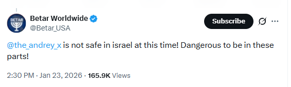Incitement #94@the_andrey_x is not safe in israel at this time! Dangerous to be in these parts!